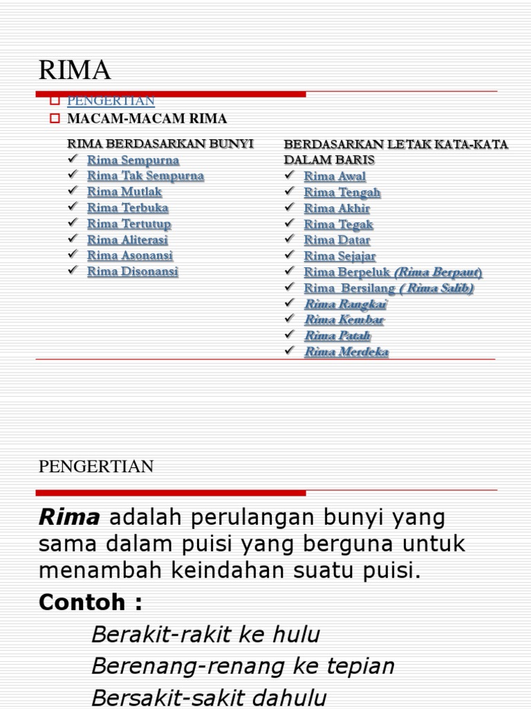 Bunyi yang berima itu dapat ditampilkan oleh tekanan nada tinggi atau perpanjangan. Rima adalah pengertian jenis beserta contohnya untuk kali ini kami akan membahas mengenai rima yang dimana dalam hal ini meliputi pengertian jenis dan contoh untuk lebih jelasnya simak. Ilmu bahasa kemarin kami bertemu dengan sahabat kami yang mengajar di universitas negeri yogyakarta bidang sastra beliau menanyakan kira kira bisa ndak untuk mengulas mengenai rima tidak perlu banyak tapi lengkap sehingga pada kesempatan ini kami akan berbagi dengan anda sebagai pengunjung setia kami akan berbagi mengenai pengertian rima dan contohnya dalam puisi. Makan telan pergi kaki.