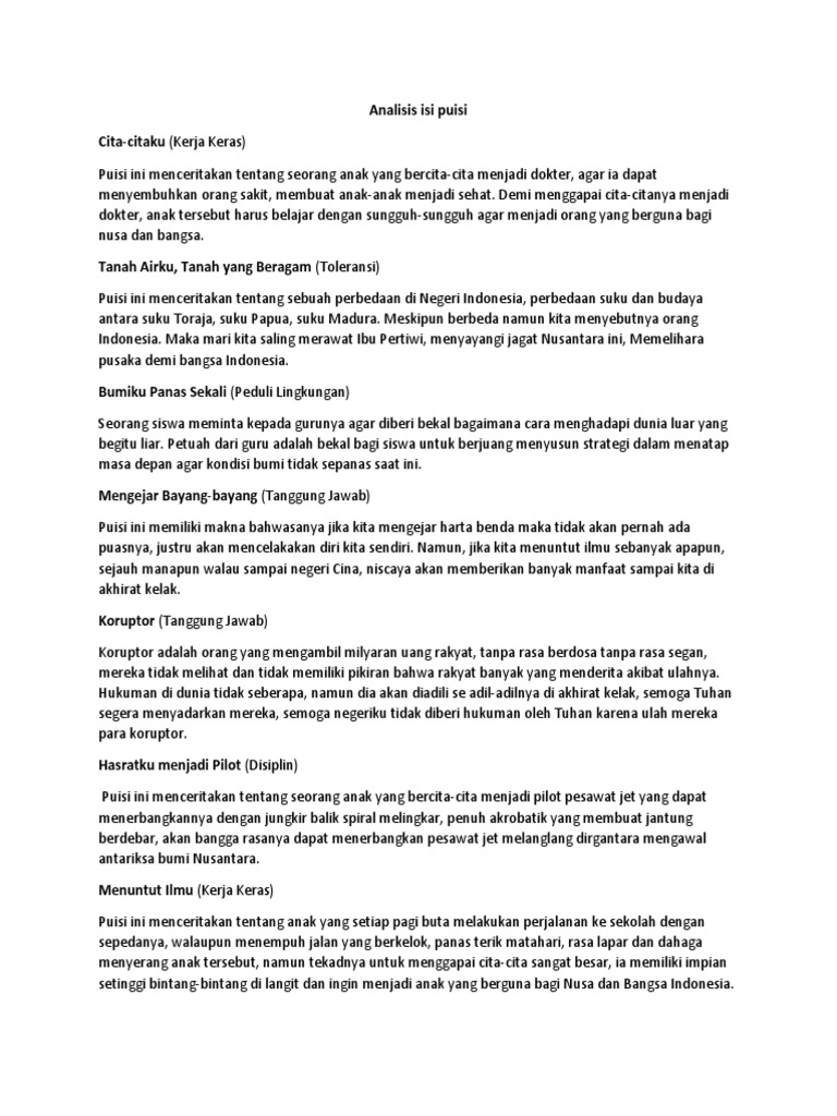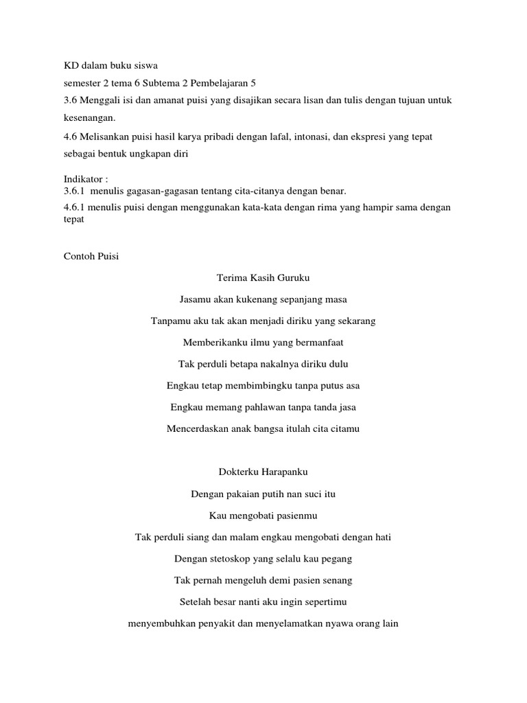 Contoh puisi cita cita. Nah di sekolah kita juga diajarkan untuk mengapresiasinya melalui puisi tentang cita cita yang telah diterapkan sejak sd. Puisi baru bisa dikatakan bebas tanpan kaidah puisi lama nah aku coba membuat puisi baru dengan 2 bait tadinya mau 5 bait tetapi kepanjangan hehe. Bukan tanpa alasan pendidikan mengenai pembuatan puisi cita citaku menjadi tentara guru dokter dan lain lainnya ini ditujukan agar para siswa sekolah menjadi lebih bersemangat dan bergairah dalam mewujudkan impian di.