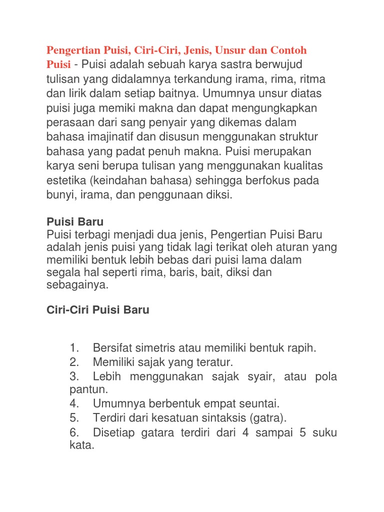 Pengertian puisi adalah jenis karya sastra yang memiliki unsur sajak bait baris dan tipografi.