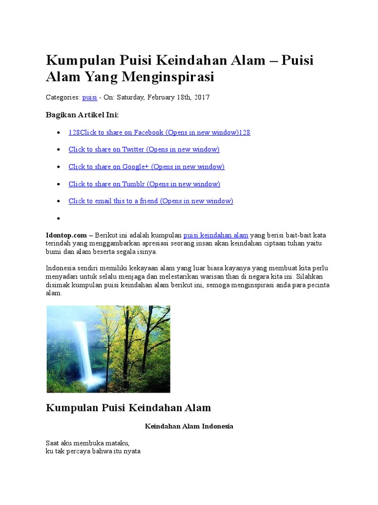 Demi melihat keindahan alam keindahan ciptaan tuhan. Tiada keindahan yang boleh mengatasi keindahan ciptaan tuhan. Kisah nabi adam as manusia pertama ciptaan tuhan. Puisi tentang alam bentuk karya sastra yang digunakan untuk mengekspresikan diri.
