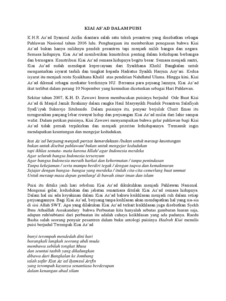 Puisi tentang perjuangan kiai. Pengaruh kiai hasyim ini sangat besar dalam konteks pemikiran fiqh karena kiai hasyim dikenal sebagai pakar hadis dan fiqh sekaligus yang mampu melahirkan pemikiran pemikiran cemelang sebagi solusi persoalan bangsa dalam skala luas hal 159. Mulai perjuangan pesantren perjuangan jam iyyah nu hingga perjuangan membela nkri. Puisi kemerdekaan indonesia perjuangan dan pahlawan selalu kita baca untuk selalu mencintai negeri ini. Tahun tahun lalu saya malah lebih kenal dengan mario lawi dengan ekaristi nya.